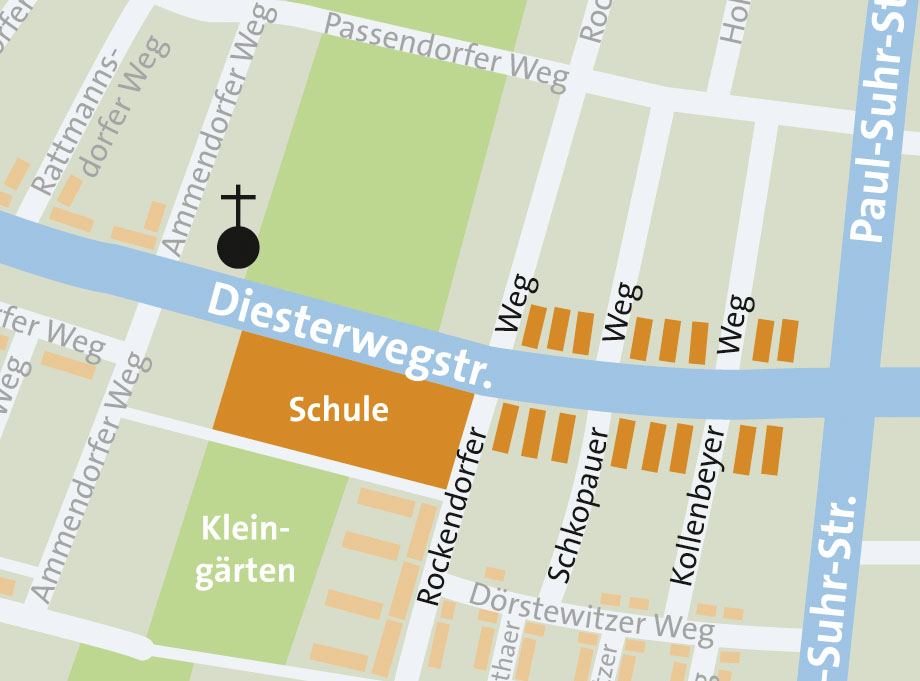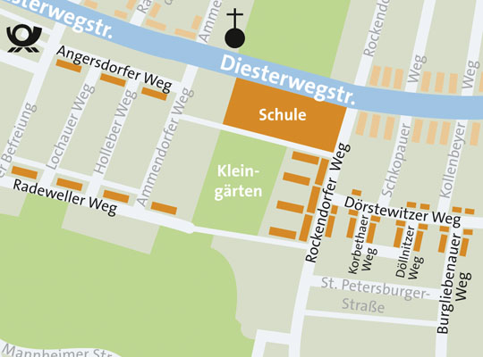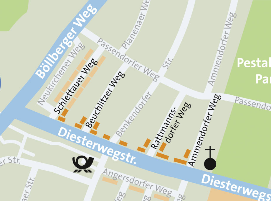 - Wohngebiet 3: in der Nähe des „Pestalozzi-Parks“, südlich der Diesterwegstraße