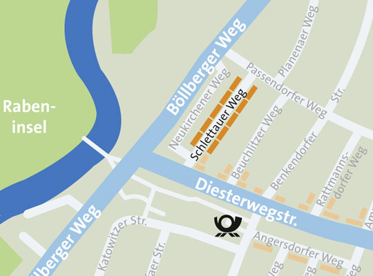 - Wohngebiet 4: entlang des Schlettauer Weges, in der Nähe der Rabeninsel mit direktem Zugang zu dieser Insel über eine im modernen Stil errichtete Saalebrücke